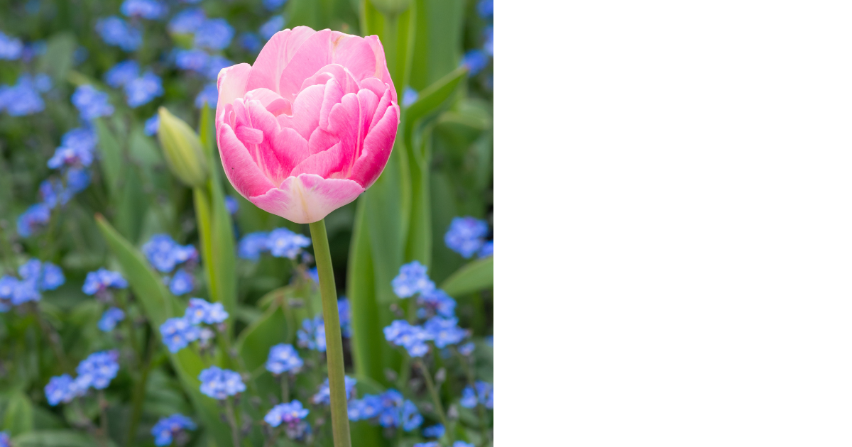 Bright pink and red tulips go with everything, though an underplanting of pale blue forget-me-nots will lift them to superstar status. Forget-me-nots (Myosotis sylvatica) are perennial flowers that come back every year. These delicate blue (sometimes pink) flowers are easy to grow and care for and will readily self-seed to create a natural-looking display. They prefer moist soil and partial shade but can tolerate various growing conditions.