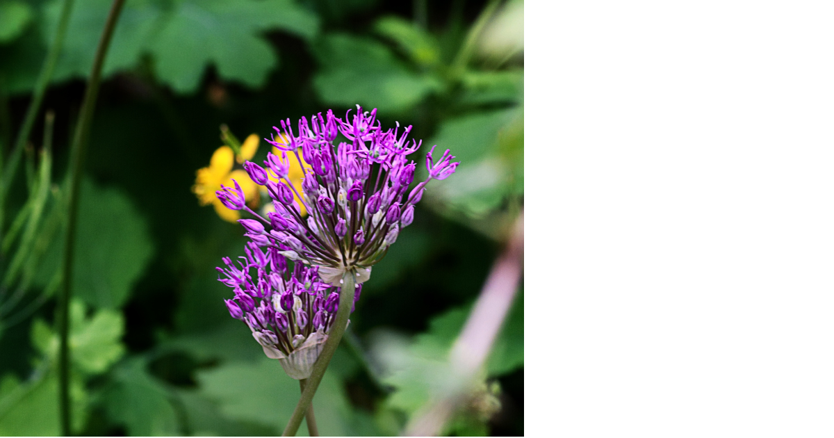 The scale of the giant purple heads of alliums (an ornamental bulb in the onion family that comes in different heights and flower sizes) planted among the large intricate leaves of the plume poppy (Macleaya cordata) is magnificent. The fact that small yellow flowers appear on the plume poppies at the same time the