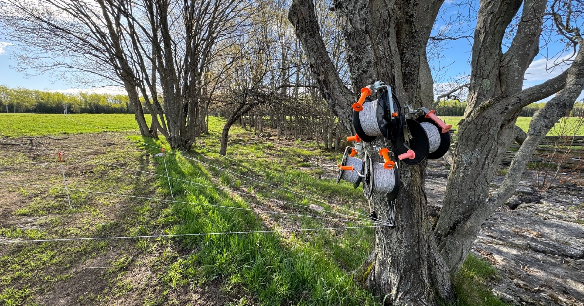 Here at my place I use hand-crank reels of what’s generically called poly wire or poly tape to divide pastures seasonally into
