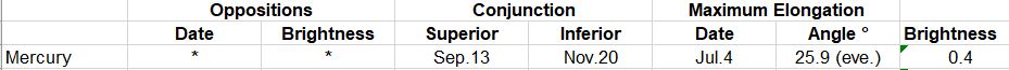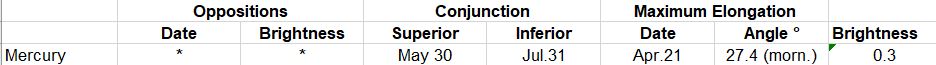 When at Opposition, planets will appear on the opposite side of the sky from the Sun – very roughly on the meridian at midnight. Conjunctions are when the planet has the same “longitude” as the Sun. A Superior Conjunction is when the planet is on the other side of the Sun, and an Inferior Conjunction is when it is between the Earth and the Sun. Only Mercury and Venus can be at Inferior Conjunction. Maximum elongation is when Mercury and Venus appear farthest from the Sun in our sky. This occurs either in our morning eastern sky (mor.) or our western evening sky (eve.). Do not apply the Ottawa-correction times to the times in this table.