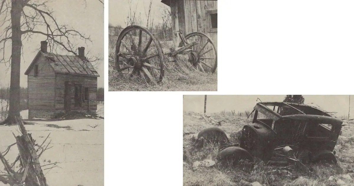 Bottom: A tree growing up through its floor boards, this once proud auto rests stripped, abandoned and vandalized near Brooke; Left: Deserted house near Delta, now famous for its annual maple syrup festivals: Middle: Wagon wheels at Westport.
