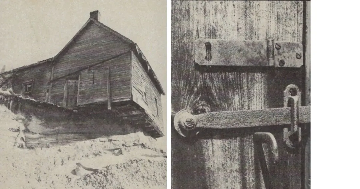 Left: Not a victim of erosion, as it would appear, this house rests precariously on the edge of an Oso township sandpit. Workers eventually burned the house in order to take the sand under it. Right: Detail of door latch.