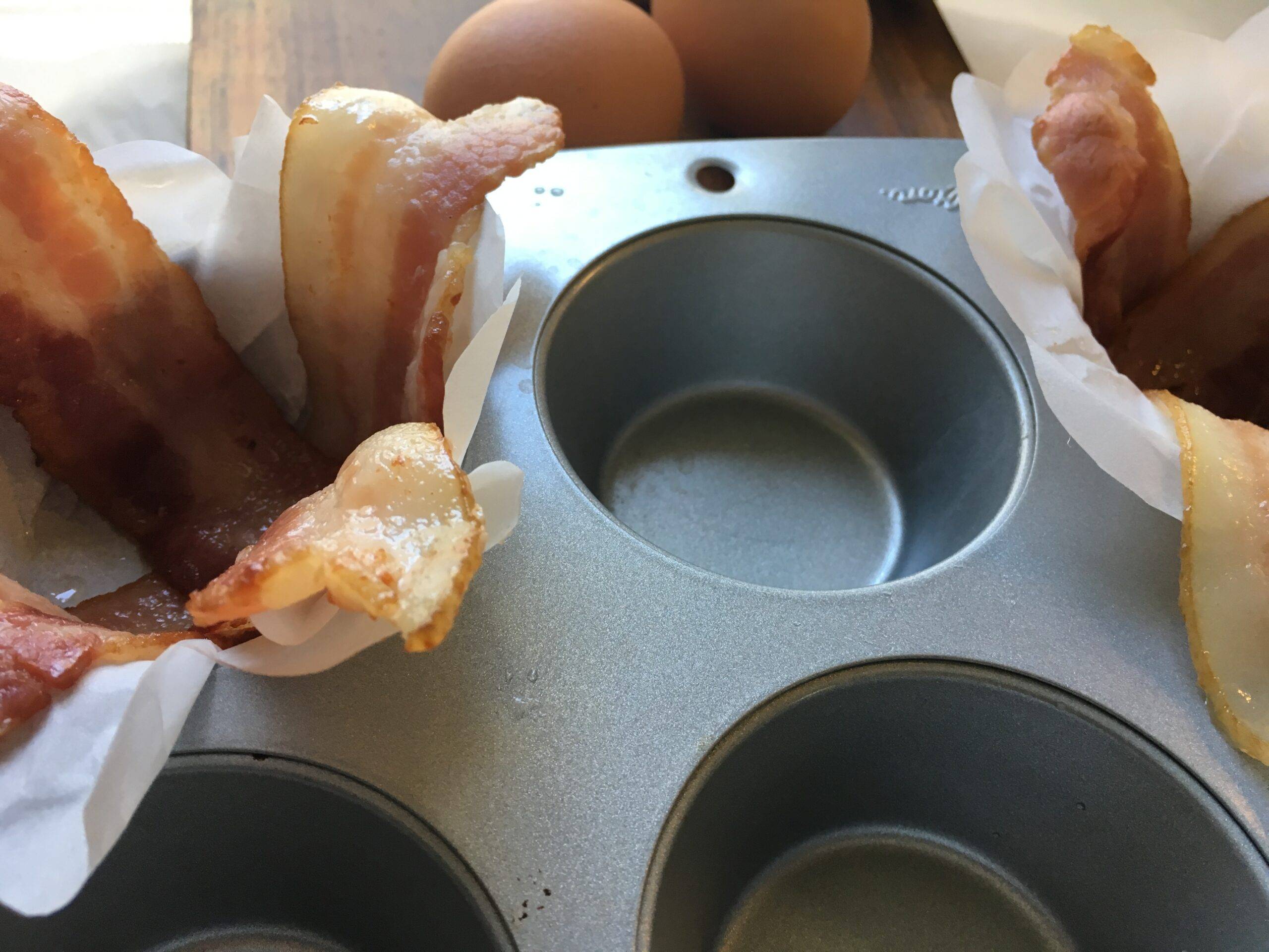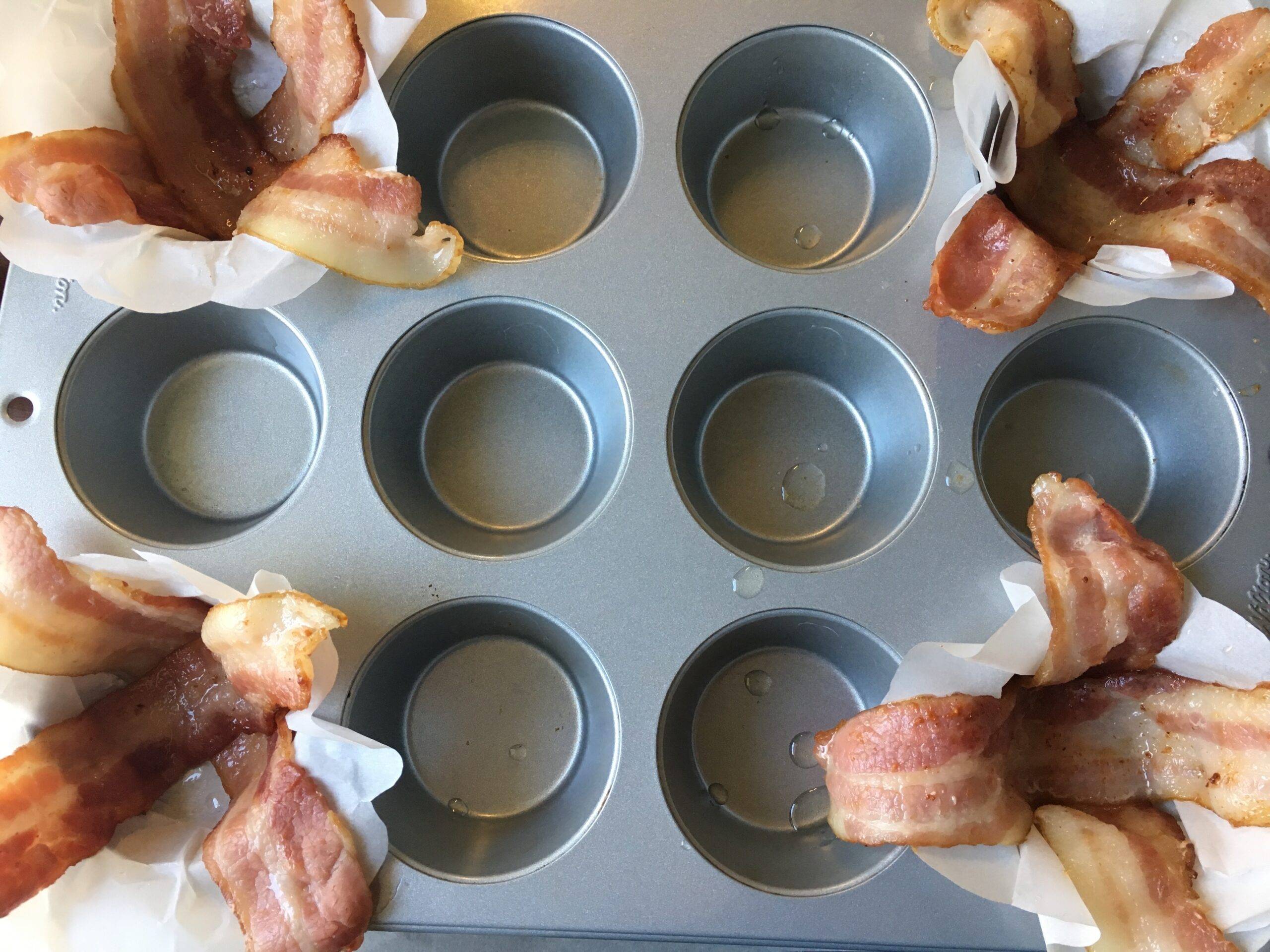 Crisscross 2 bacon strips in each of 4 muffin cups. Crumble and divide aged cheddar evenly between the four muffin cups.